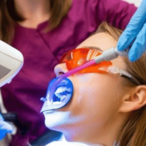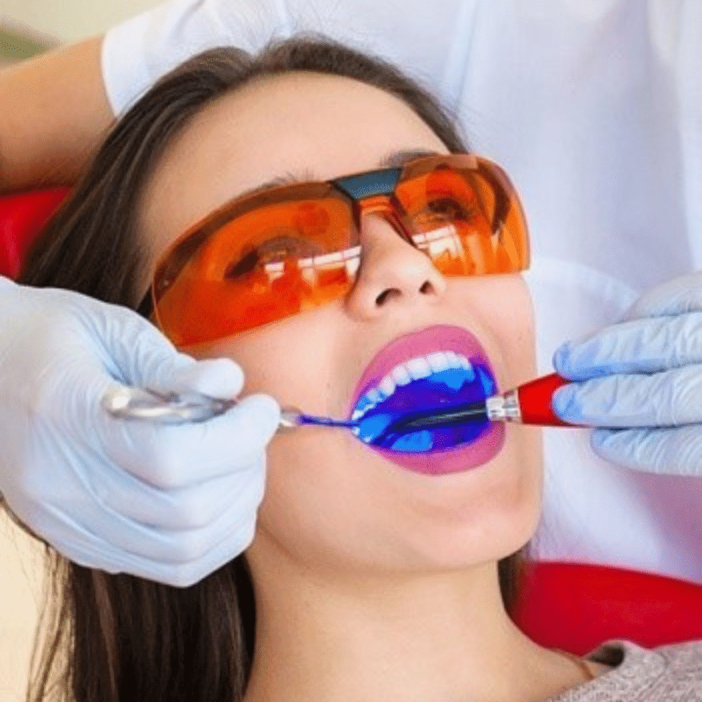 Laser teeth whitening (also known as laser bleaching) is an in-clinic cosmetic dental treatment. It involves applying a hydrogen peroxide–based bleaching gel to your teeth, which is then activated using a precise laser beam to rapidly eliminate surface and deeper stains.